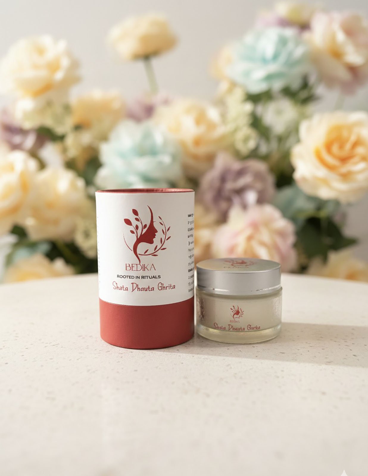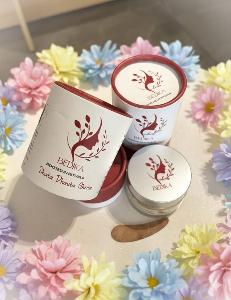 Pure, Sacred & Timeless : A rare elixir crafted from 100% natural Bilona Ghee, meticulously washed 100 times in crystal-clear filtered water, each cycle enriched with the resonance of sacred mantras. Blended with therapeutic essential oils, it nurtures all seven layers of the skin, restoring balance, soothing irritation, and enhancing natural radiance-leaving you glowing with vitality, purity, and grace.