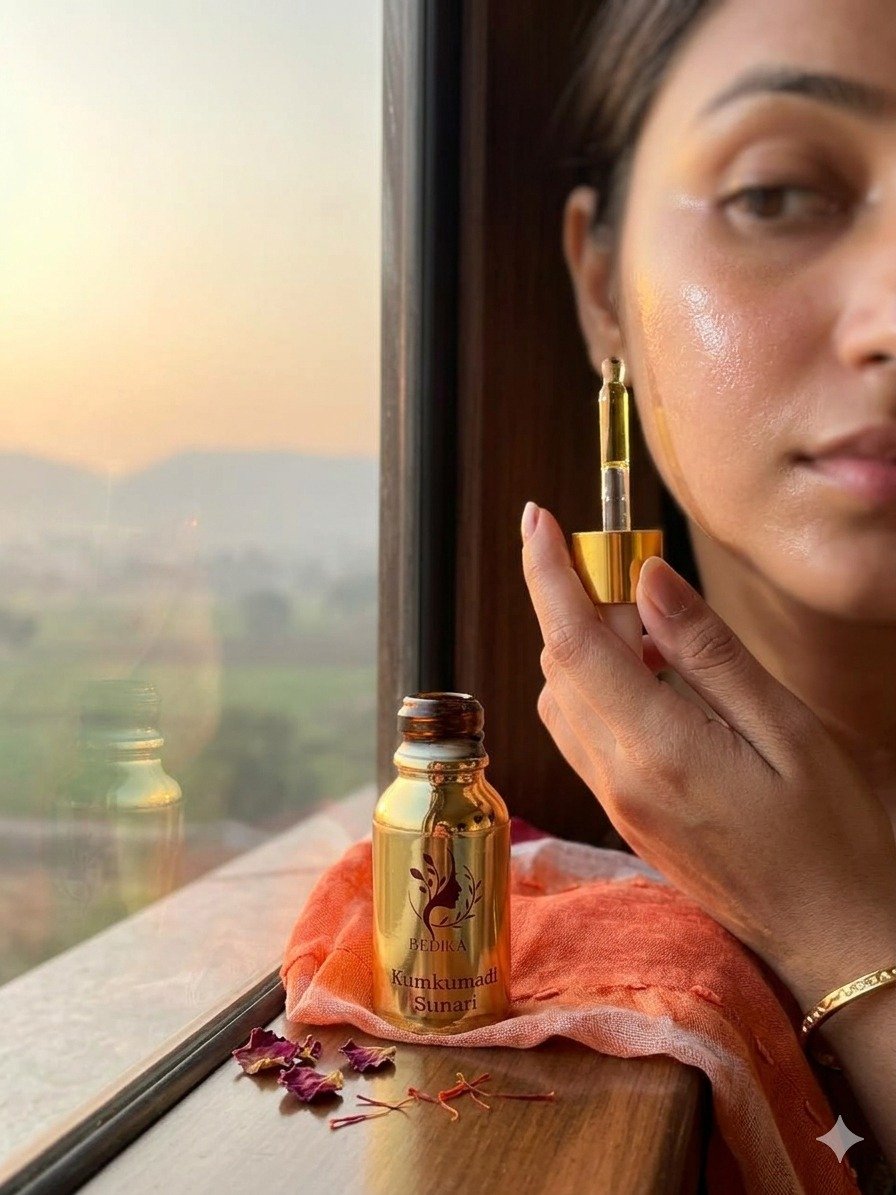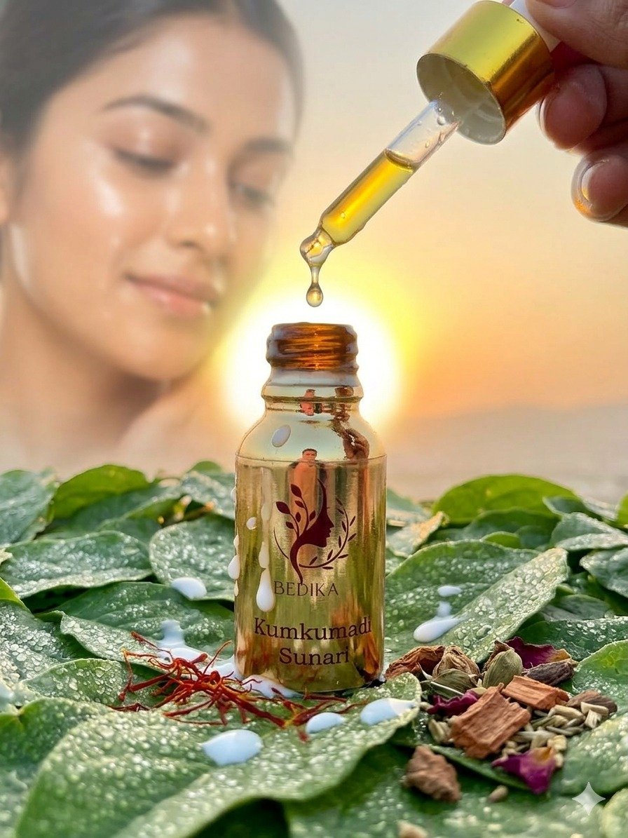 Kumkumadi Suta Tailam (Night): Deeply penetrates through all seven layers of the skin to repair, reduce pigmentation, and fade scars while you rest.