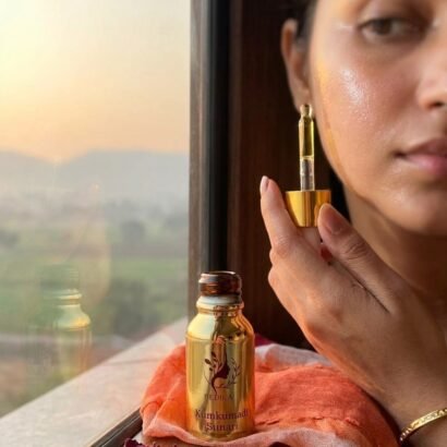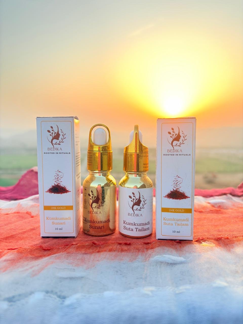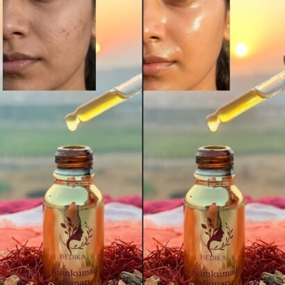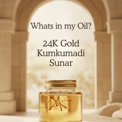 Kumkumadi Sunar (Day): Infused with saffron and 24K gold, it nourishes, enhances radiance, and protects—giving you a luminous, even-toned glow through the day.