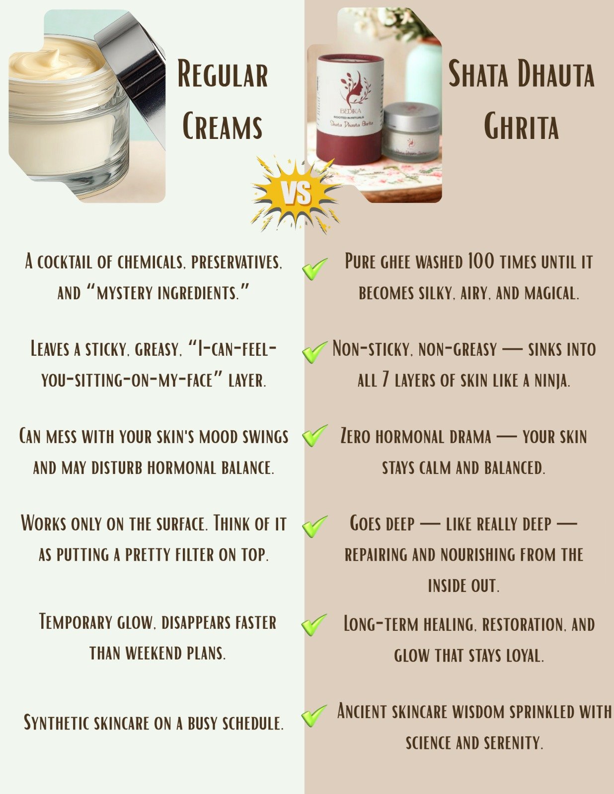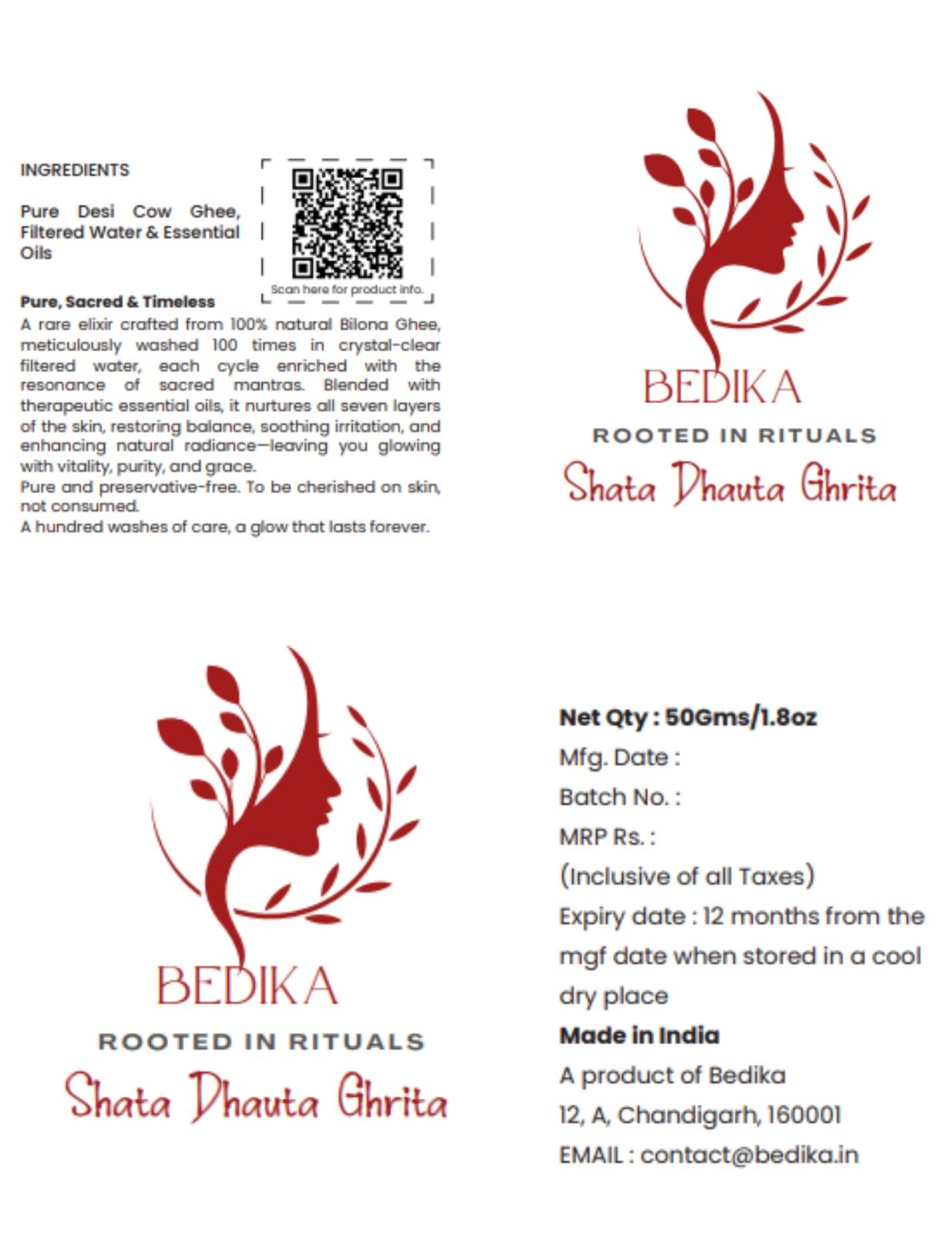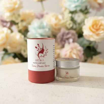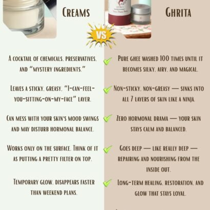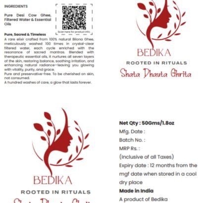 Pure, Sacred & Timeless : A rare elixir crafted from 100% natural Bilona Ghee, meticulously washed 100 times in crystal-clear filtered water, each cycle enriched with the resonance of sacred mantras. Blended with therapeutic essential oils, it nurtures all seven layers of the skin, restoring balance, soothing irritation, and enhancing natural radiance-leaving you glowing with vitality, purity, and grace.